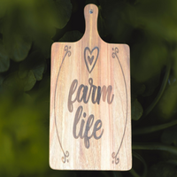 We do some custom work, such as cutting and charcuterie boards, as well as custom laser engraving. If you can describe it, we can usually come up with a design for you. All custom work will be sent as a mock up for approval prior to work starting. Please see Shop Policies for more information on custom work.