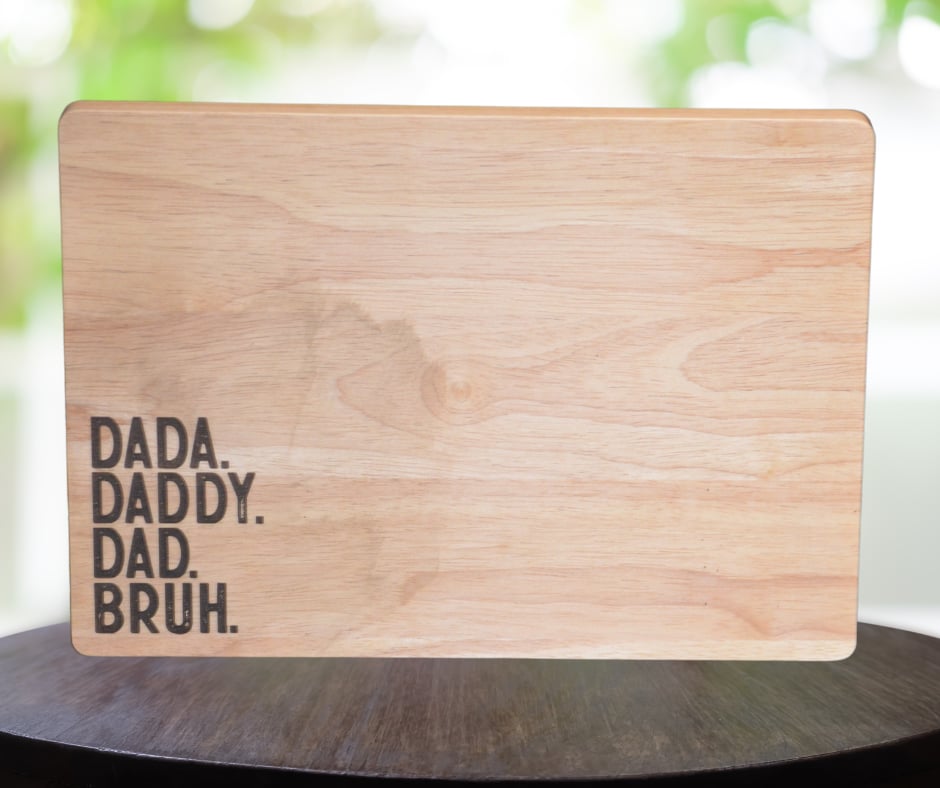 This charming rubberwood cutting board is both functional and sentimental, making it a perfect gift for the special father figure in your life. Measuring 10.75" by 13.75", this board offers ample space for all your chopping needs while adding a personal touch to your kitchen decor. The laser-engraved message, "Dada. Daddy. Dad. Bruh.," playfully captures the evolution of a father's role over time. Equipped with anti-slip feet, this cutting board ensures stability and safety during use, preventing any unwanted slipping or sliding. Its durable rubberwood construction promises longevity and resilience, making it a practical yet heartfelt addition to any kitchen. Whether it's for Father's Day, a birthday, or just because, this cutting board is sure to be a cherished keepsake.