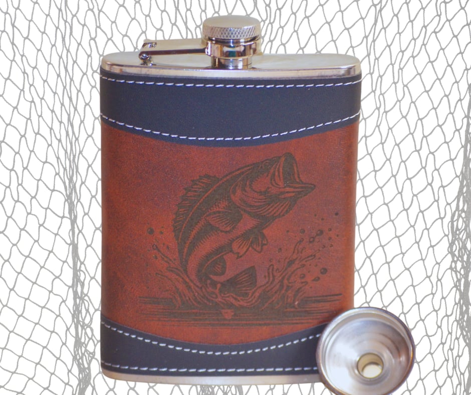 The leatherette-covered hip flask is a perfect blend of style and functionality, designed for those who appreciate both aesthetics and practicality. Its two-toned finish, with a sleek stainless steel base, offers a modern and sophisticated look. The inclusion of a funnel ensures easy filling without any spills, making it convenient for on-the-go use. Adding a touch of uniqueness, the flask is laser engraved with a dynamic image of a fish jumping from water, which not only enhances its visual appeal but also makes it a great gift for fishing enthusiasts or nature lovers. This hip flask is not just a container for beverages; it's a statement piece that combines elegance with a personal touch.