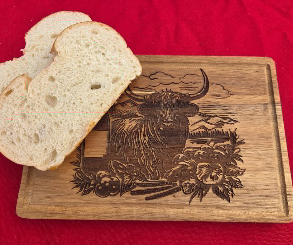 This Highland cow acacia decorative charcuterie board is a charming and practical addition to any kitchen or dining space. Measuring at 6.25"x9.25", it is perfectly sized for serving a delightful charcuterie spread. Crafted from durable acacia wood, known for its rich, warm tones and natural resistance to water, this board not only offers functionality but also adds a touch of rustic elegance to your home décor. This board makes for an affordable yet thoughtful gift for friends or family who appreciate both style and utility in their kitchen accessories.