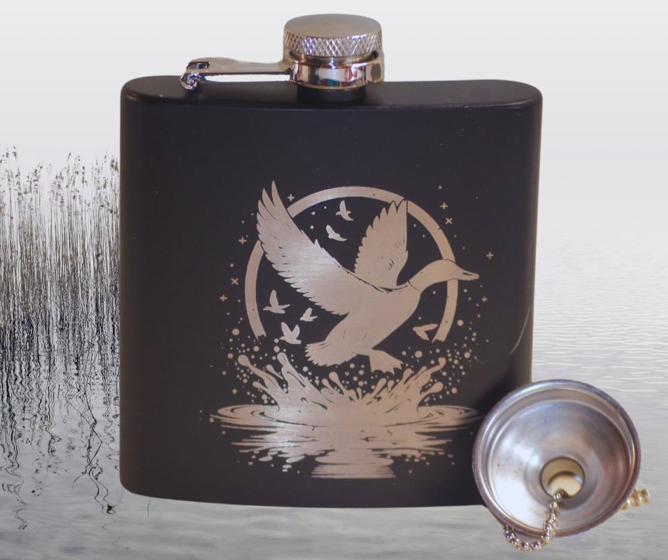 This sleek and stylish hip flask is crafted from black anodized aluminum, offering both durability and a modern aesthetic. With a capacity of 6 ounces, it’s the perfect size for carrying your favorite beverage discreetly. The flask features a laser-engraved design of a duck gracefully landing on water, adding a touch of nature-inspired elegance to its appearance. Included with the flask is a convenient funnel, ensuring easy and spill-free filling. This hip flask makes an excellent gift for outdoor enthusiasts, hunters, or anyone who appreciates a combination of functionality and artistic detail in their accessories.