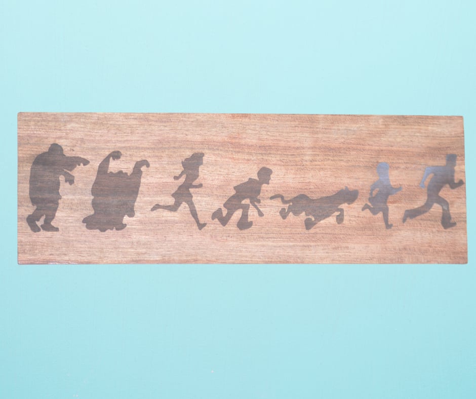 This whimsical walnut plaque captures the essence of a Saturday morning cartoon, featuring everyone's favorite ghost-hunting gang and their loyal dog. This design showcases the gang in a comical scene, laser-engraved in fine detail as they flee from mischievous monsters. The plaque, approximately 4"x10", is a perfect tribute to those nostalgic moments of animated adventures and mystery-solving escapades. Each character is depicted in a dynamic pose, while the dog adds a sense of fear and panic. This delightful piece would surely bring a smile to anyone who remembers those classic cartoon capers.