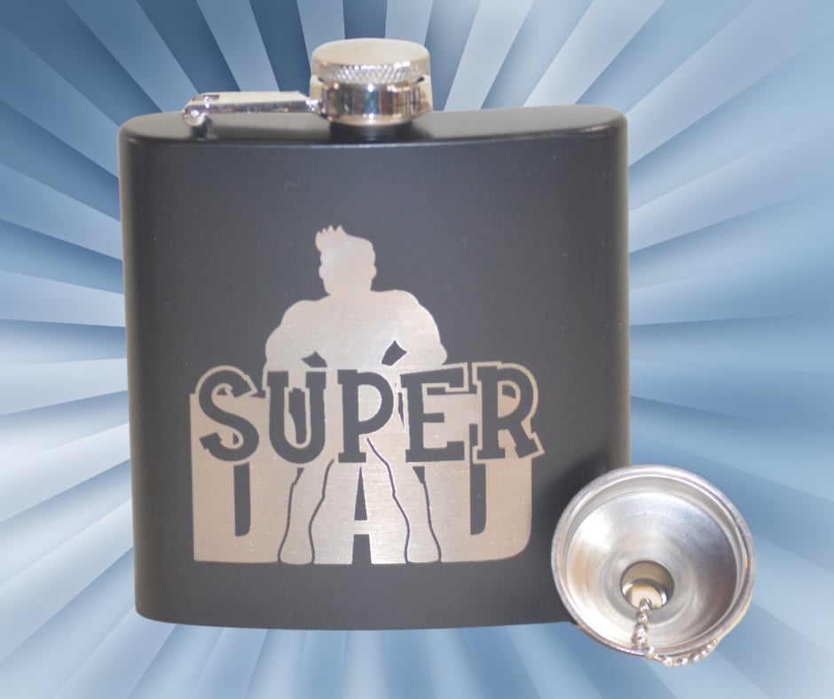 Introducing the Super Dad Flask, a sleek and stylish tribute to the everyday hero in our lives. Crafted from premium matte black anodized aluminum, this 6-ounce flask is not only durable but also boasts an elegant, modern finish that is sure to impress. The laser engraving adds a personalized touch, making it a perfect gift for fathers who deserve a little something special. Whether it's for a birthday, Father's Day, or just because, this flask is designed to celebrate and honor dads who go above and beyond. Plus, it comes with a convenient funnel, ensuring easy and spill-free refills. Cheers to all the Super Dads out there!
