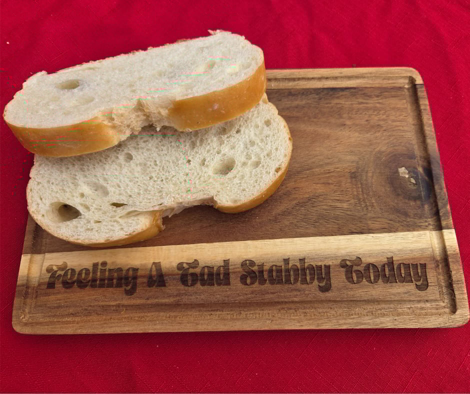 This cheeky and functional cutting board, measuring 6"x9", is the perfect addition to any kitchen. It features the playful phrase "Feeling a Tad Stabby Today," making it a great conversation starter and a fun gift for those who enjoy cooking with a side of humor. Crafted from high-quality wood and finished with a food-safe wood conditioner, this cutting board not only adds charm to your countertop but also ensures durability and safety when preparing your favorite meals. This cutting board is an affordable and delightful way to enhance your culinary adventures.