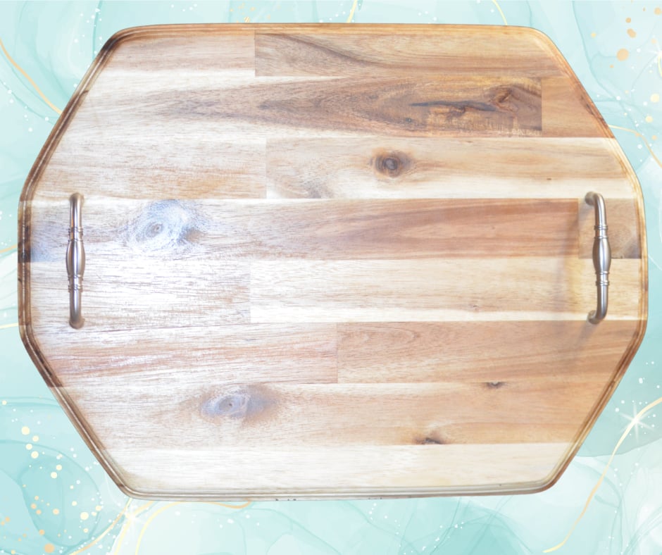 Introducing our exquisite Acacia Charcuterie Board, an elegant addition to any kitchen or dining experience. Hand-crafted with precision, this board features beautifully angled corners and a decorative routered edge that adds a touch of sophistication. The non-slip feet ensure stability while serving, making it both functional and stylish. The addition of silver handles offers a sleek, modern look. Made from solid wood, this board is food safe and conditioned with Black Hills Board Balm, ensuring durability and a lustrous finish that enhances the natural beauty of acacia. Perfect for entertaining or as a thoughtful gift, this charcuterie board is designed to impress.